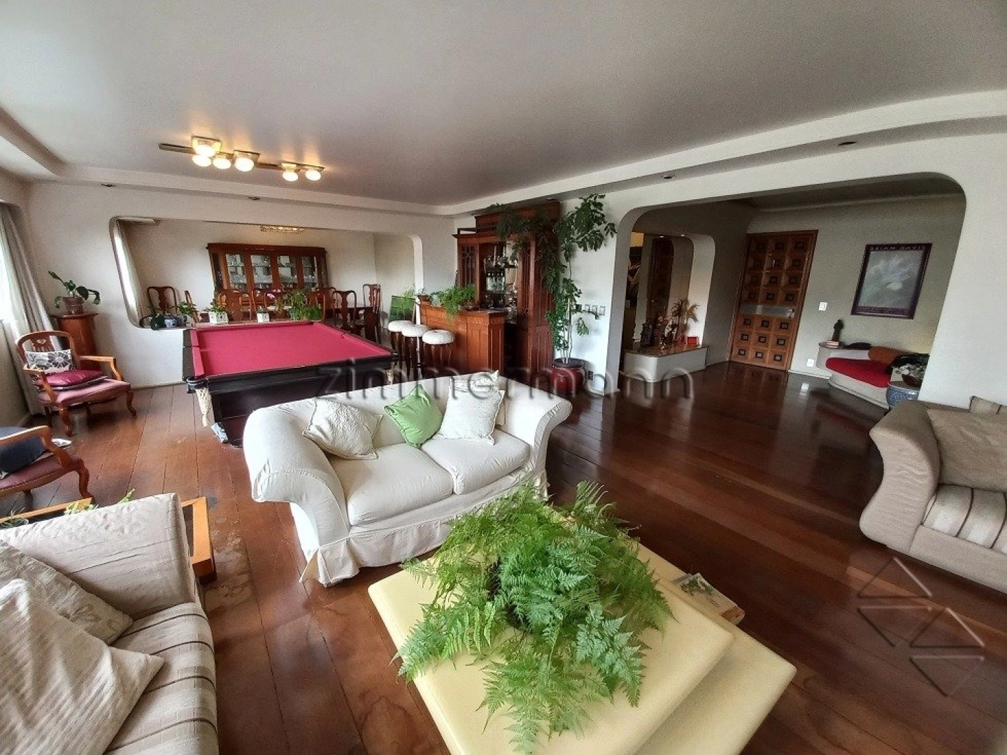O living é tão amplo que os proprietários se deram ao luxo de instalarem uma mesa de bilhar oficial no espaço de um dos ambientes das salas.