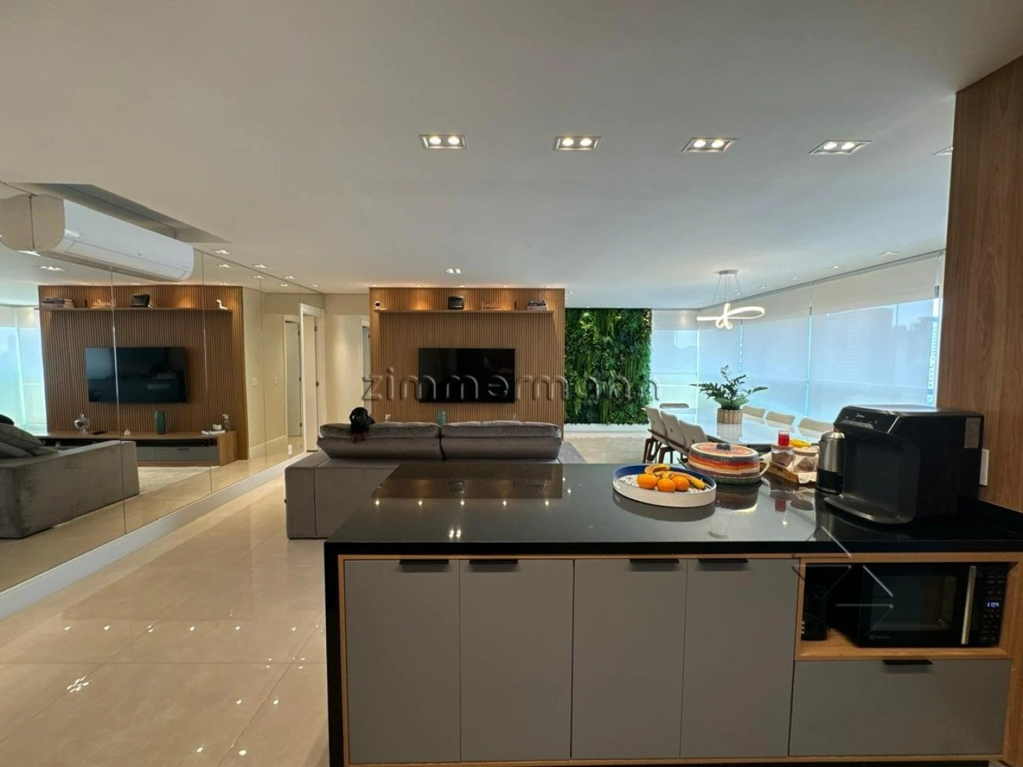 São 3 dormitórios dormitórios sendo uma suíte, e todos os quartos equipados com ar-condicionado. A cozinha é planejada, com bancada em granito e churrasqueira elétrica embutida.