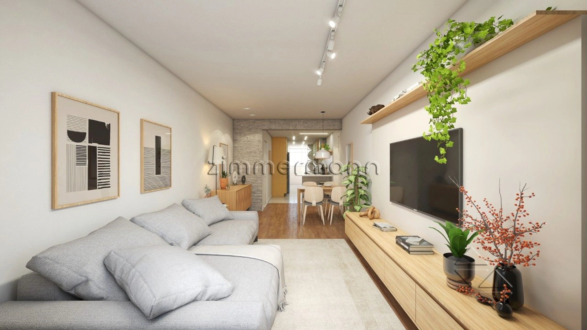 Nossa arquiteta Tamires Souza atualizou essa planta com a criação de uma suíte, e com a integração da cozinha à sala. De quebra, deixou pilares e vigas em concreto aparente, e adicionou uma charmosa divisória de cobogó para separar a cozinha da área de serviço.