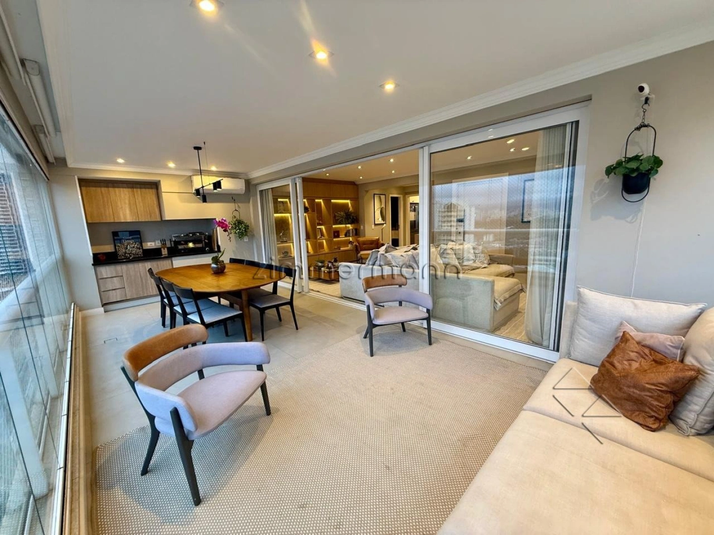 Conta com living para dois ambientes, terraço gourmet com churrasqueira, persianas automatizadas e lavabo. São 3 suítes, todas com armários embutidos e ar-condicionado. Dispõe ainda de cozinha planejada, área de serviço e dependência de serviço.