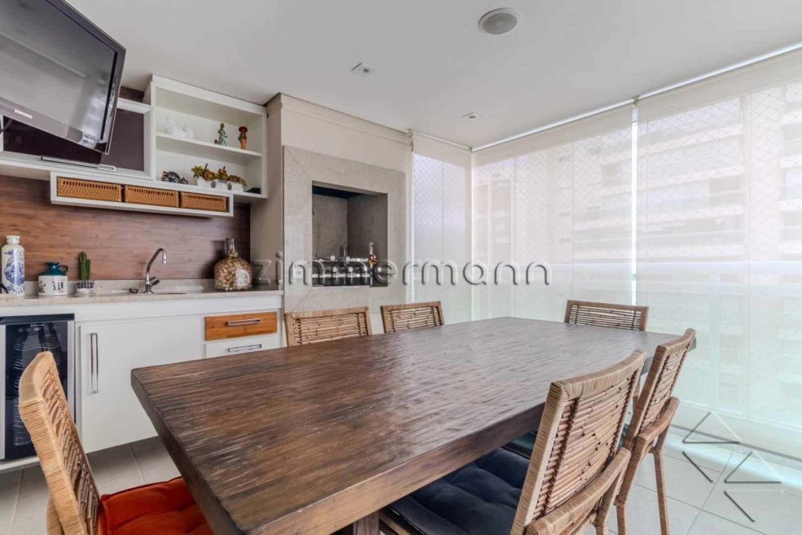 Com ar-condicionado em todos os ambientes, inclusive na varanda, o apartamento proporciona um clima agradável em qualquer estação. A varanda gourmet é um charme, equipada com churrasqueira, ainda que coberta por marcenaria. A cozinha é espaçosa e a área de serviço é funcional.