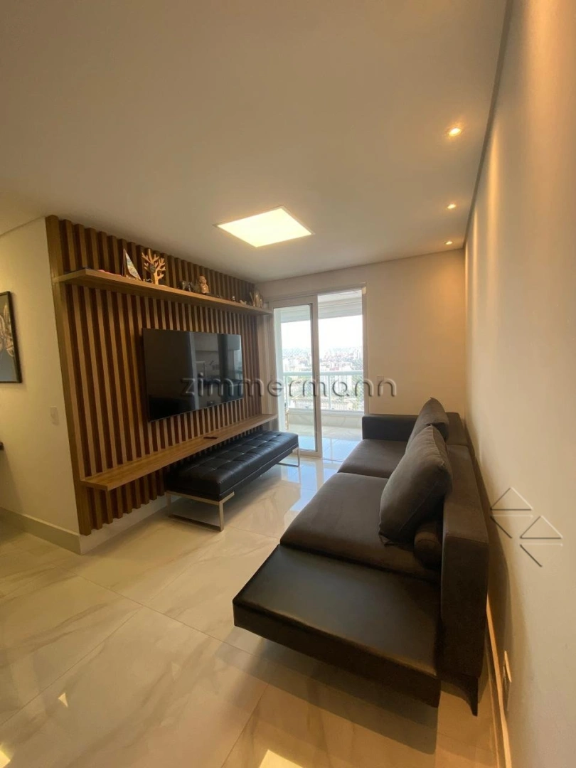 O imóvel possui living para 2 ambientes, integrado à cozinha, além de varanda com churrasqueira, criando um espaço agradável para receber. Conta também com área de serviço. Na área íntima são 2 dormitórios, sendo 1 suíte, todos com armários planejados. O apartamento possui ar-condicionado em todos os ambientes.